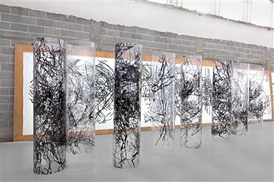 קו מיתר, מיצב מונומנטלי של האמנית, דניאלה שינמן מציג ציורים גדולים בגרפיט על בד ועל נייר לצד עבודות בתלת מימד. גלריה ליטבק, תל-אביב